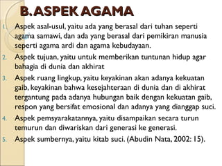 Tuhan itu mencipta dan berkuasa atas segala sesuatu di muka bumi ini. Terdapat lembaga tertentu yang mengatur tata tertib anggota atau umatnya 3. Agama boleh dibilang merupakan nilai-nilai ajaran atau tuntunan pokok yang perlu dipatuhi dan diterapkan oleh penganutnya.